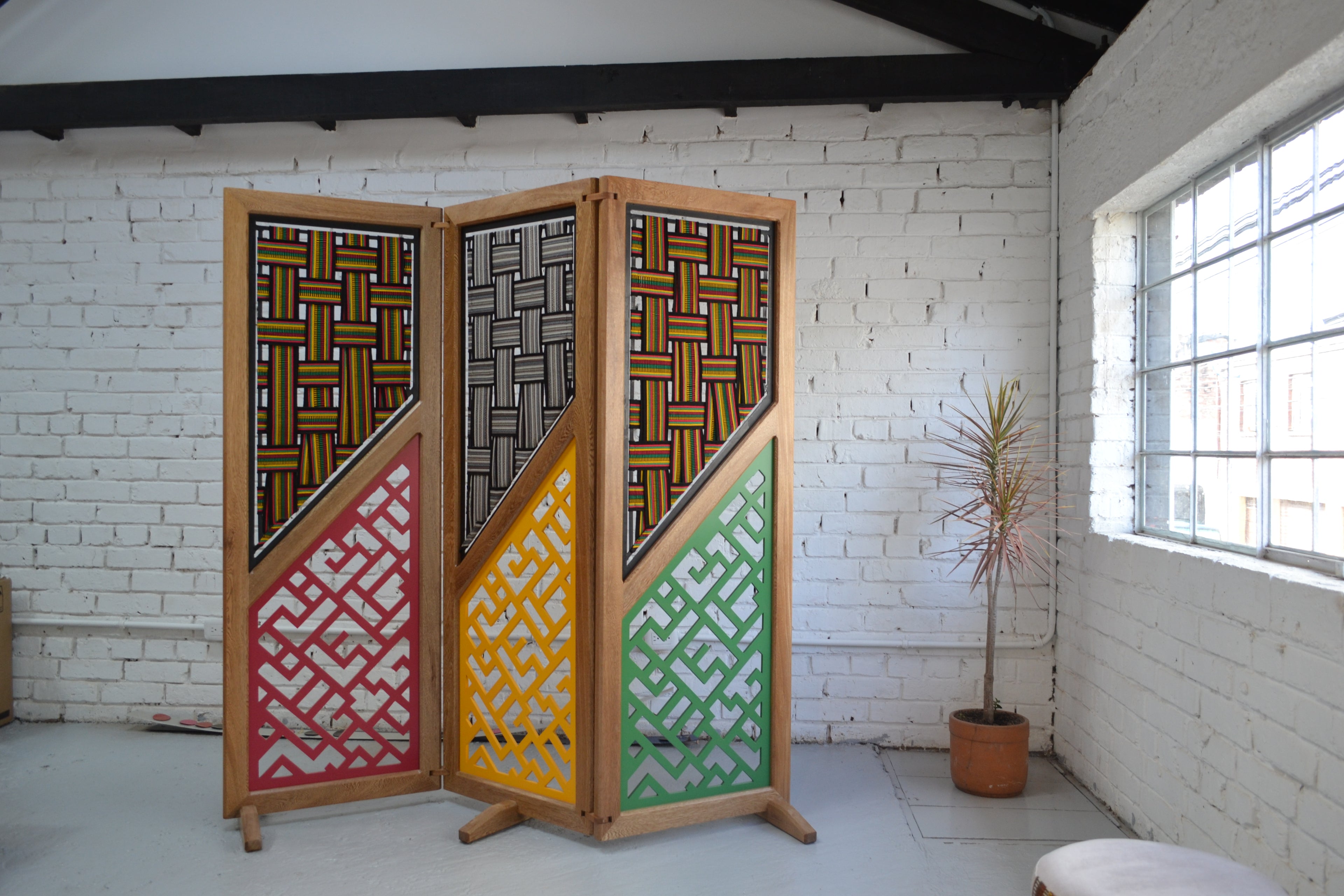 With a design of simple lines, this decorative piece mixes colored panels with handmade fabrics that add more texture to its design. A functional decorative as it can be used to decorate or separate environments.