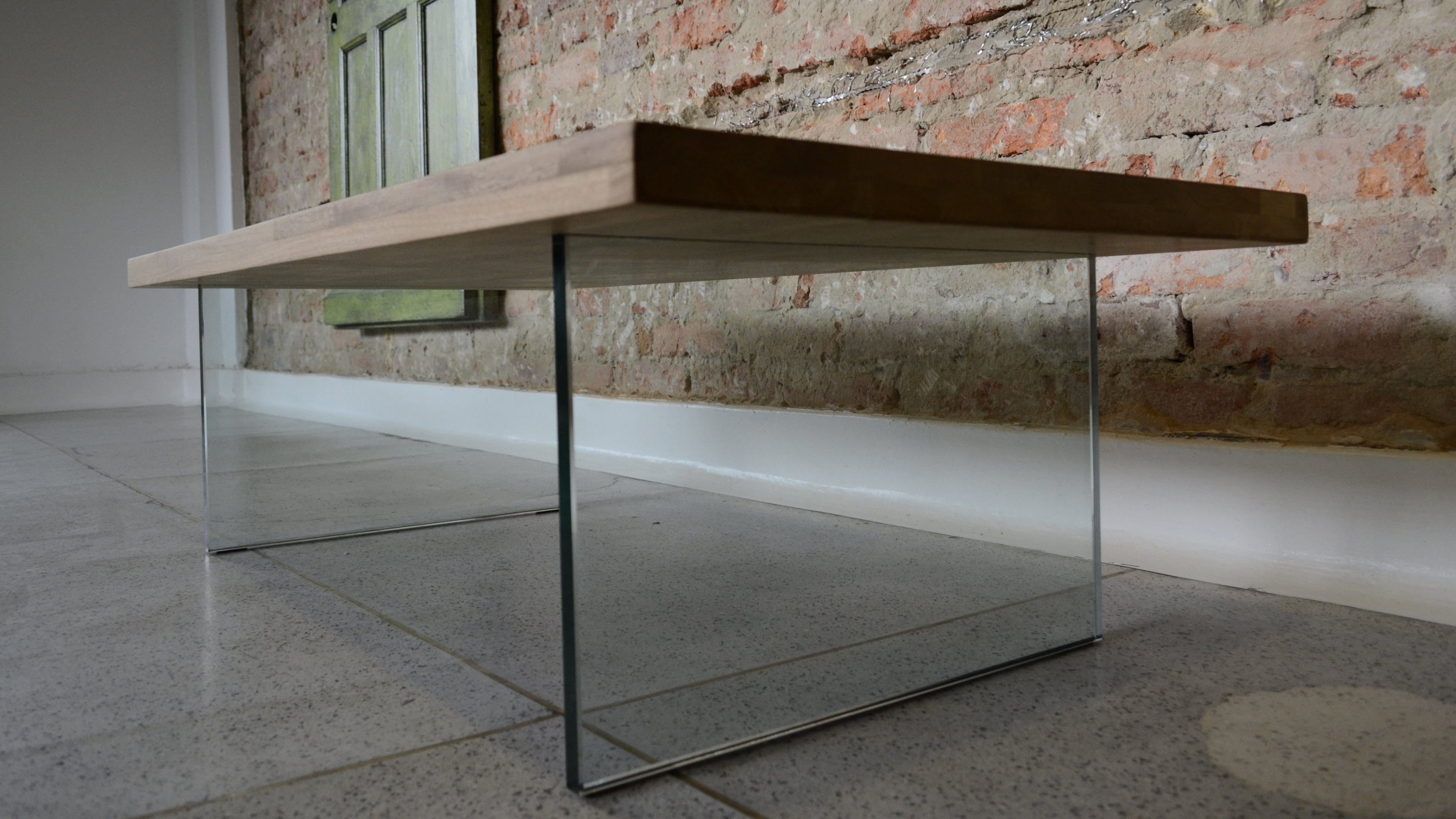 Table made of solid Colombian oak wood and glass. For interior use.